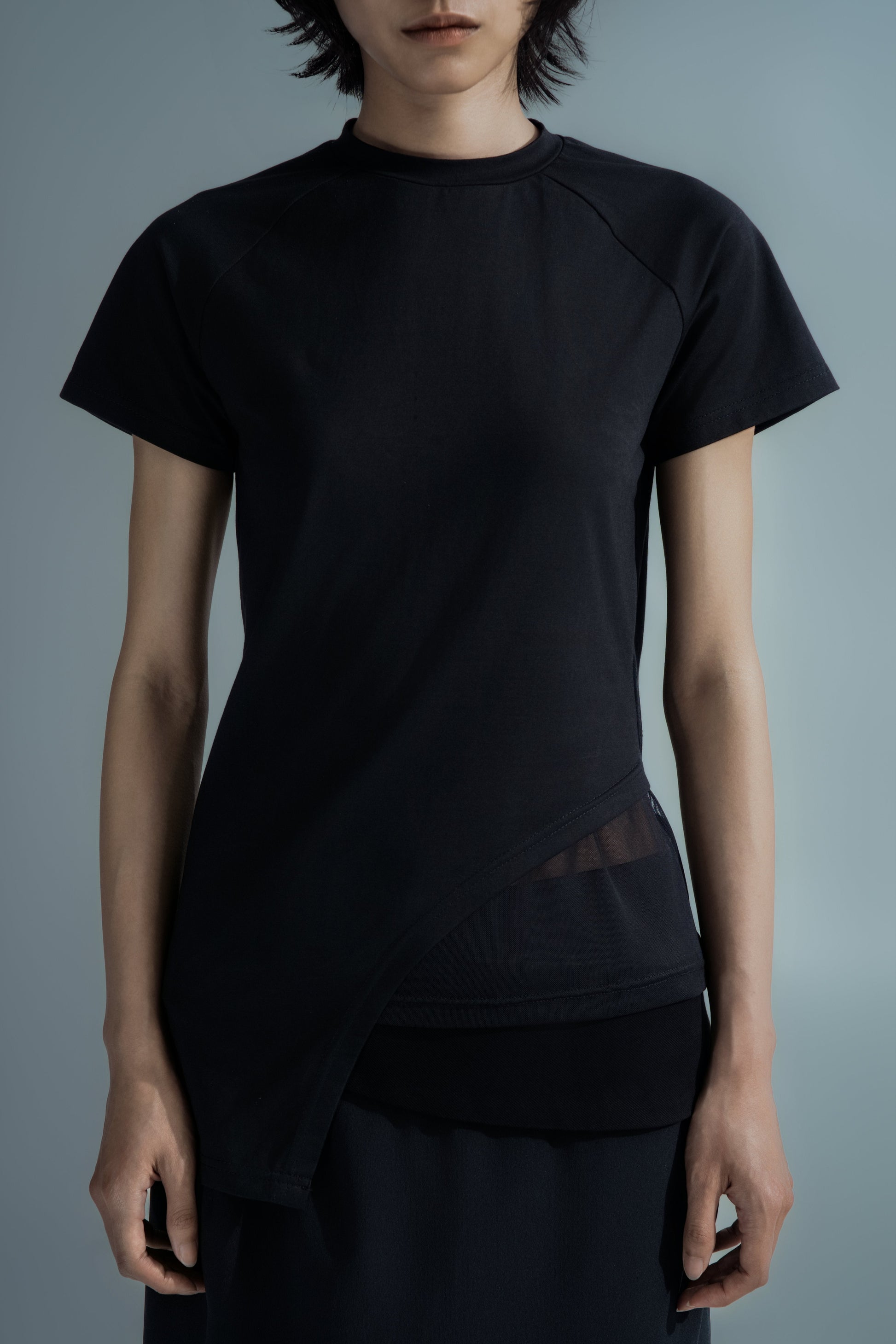 Erratic Top is a layered cotton spandex blend and mesh t-shirt that features a cut out layered bottom.