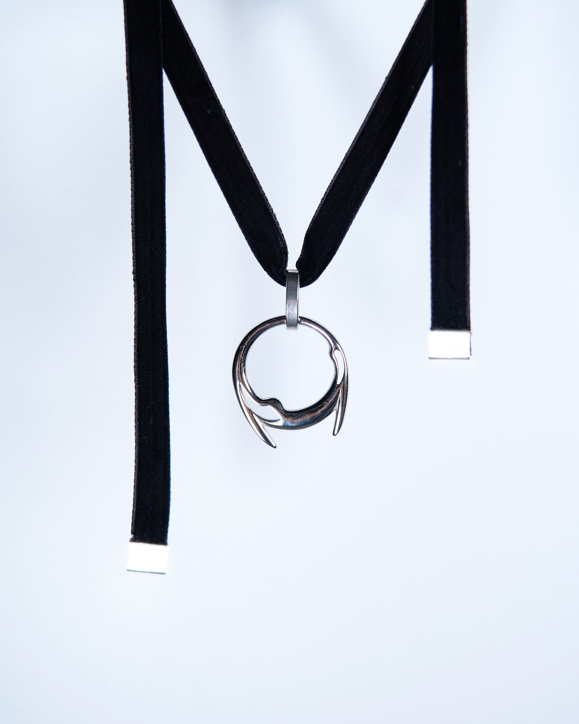 Tranquility Necklace features a stainless steel Vehemence motif pendant with a velvet black ribbon.